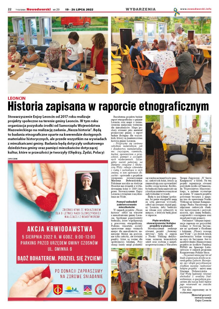 Przypominamy, że efektem projektu będzie raport etnograficzny o gminie Leoncin oraz mapa z zaznaczonymi miejscami ważnymi dla mieszkańców. Mapa posłuży również jako materiał promocyjny gminy, a raport będzie dostępny dla wszystkich, którzy są zainteresowani historią gminy Leoncin.